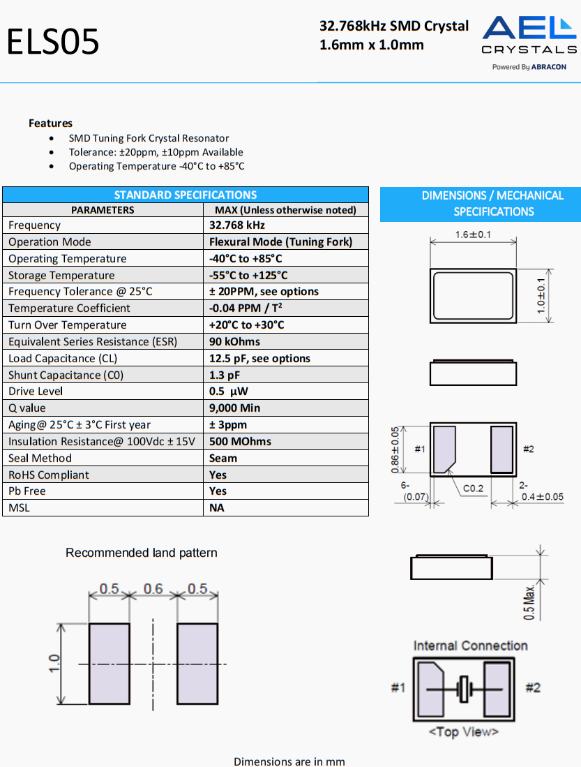 美國AEL晶振,ELS05超小型晶振,ELS05-32.768kHz-9-T無人機晶振,美國AEL晶振公司,1610晶振,歐美晶振,二腳晶振,超小型晶振,AEL晶振,ELS05晶振,ELS05-32.768kHz-9-T晶振,音叉晶振,貼片晶振,環保無鉛晶振,高穩定性晶振,石英晶振,無源晶振,低成本緊密頻率穩定晶體金屬封裝,特點:SMD音叉晶體諧振器,公差:±20ppm,±10ppm可用,工作溫度-40°C至+85°C符合RoHS標準(無鉛),低外形通孔封裝,at切割晶體,優異的老化,非常緊密的溫度穩定性,行業標準引線間距。