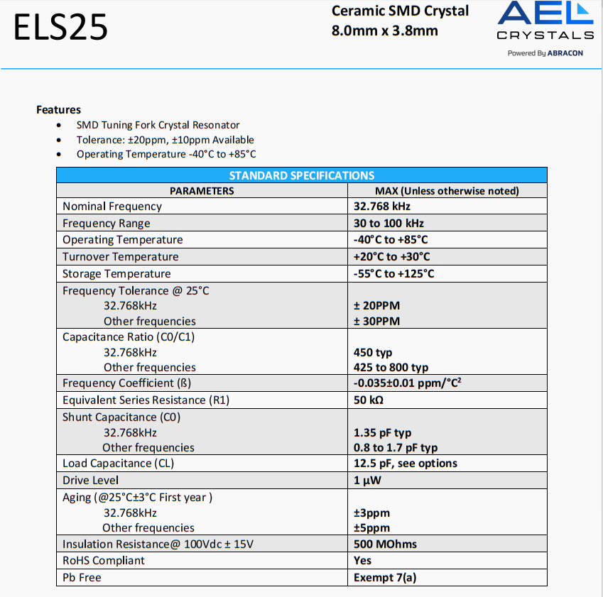 ELS25-32.768kHz-T | AEL Crystals | ELS25 | 32.768 kHz | 0 | ±20ppm | 12.5 pF |