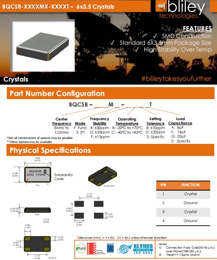 百利Bliley晶振,6G路由器晶振,BQCSB-38.400MF-BCDGT石英晶振,美國Bliley晶振公司,歐美進口晶振,百利晶振,高品質晶振,歐美晶振,6035晶振,四腳晶振,貼片晶振,石英晶振,6G通訊設備晶振,高精度儀器晶振,6G以太網晶振,無源晶振,SMD封裝,標準6X3.5mm包裝尺寸,高溫下高穩定性