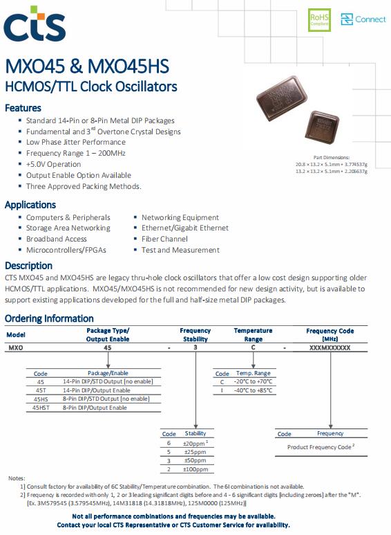MXO45-3I-1M0000 | CTS晶振 | MXO45 | 1MHz | 5V | ±50ppm | -40°C ~ 85°C |