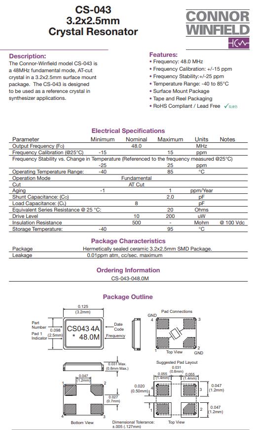 CS-043-048.0M | Connor-Winfield晶振 | CS-043 | 48MHz | ±25ppm | ±15ppm | 8pF |
