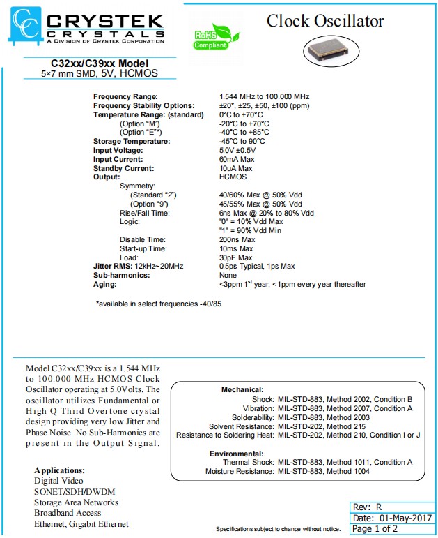 C3290-30.000 | Crystek Crystal | C3290 | 有源晶振 | 30MHz |
