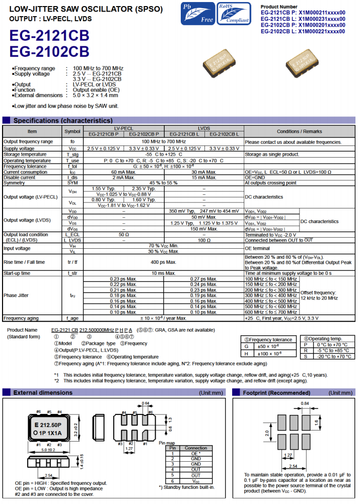 X1M0002110001 | EG-2121CB | 156.250000 MHz | 5.00 x 3.20 x 1.40 mm | LV-PECL | 2.375 to 2.625 V | 0 to 70 °C |