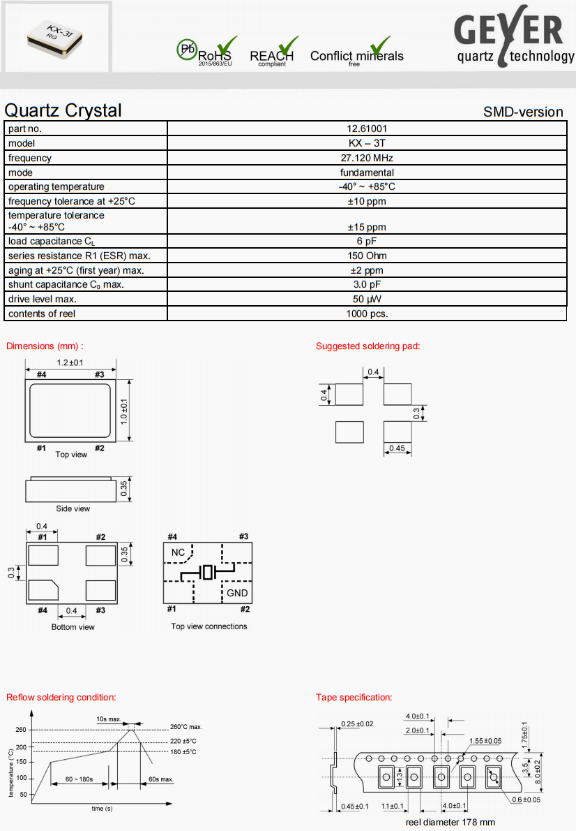 12.60024 | Geyer晶振 | KX-7E | 27 MHz | ±100ppm | ±30ppm | 12pF |