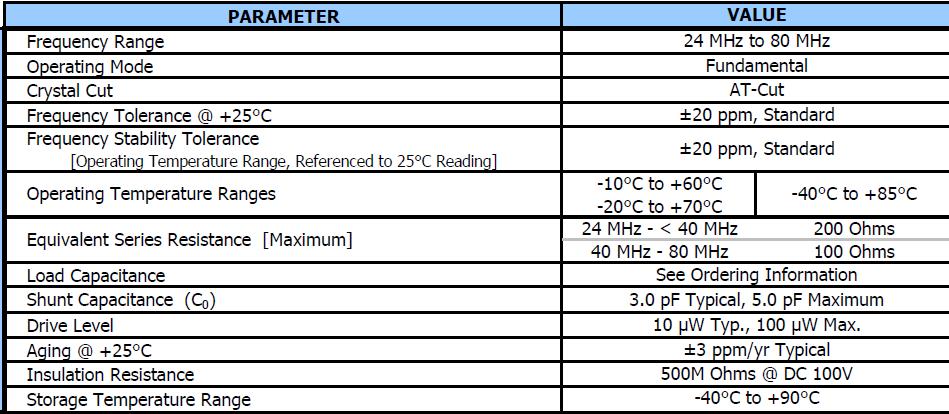 標準1.6毫米x 1.2毫米縫焊包,基本晶體設計,24 - 80 MHz頻率范圍,頻率公差,±20 ppm標準,頻率穩定度,±20 ppm標準,操作溫度為-40°C + 85°C,磁帶和卷軸包裝標準,eia - 481,符合RoHS /綠(6/6).