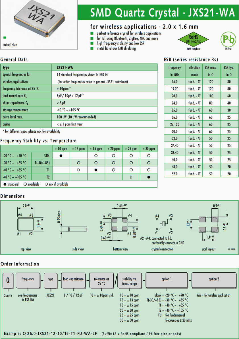 Q 19.2-JXS21-8-10/10-WA-LF | Jauch晶振 | JXS21-WA | 19.2MHz | ±10ppm | 8pF |