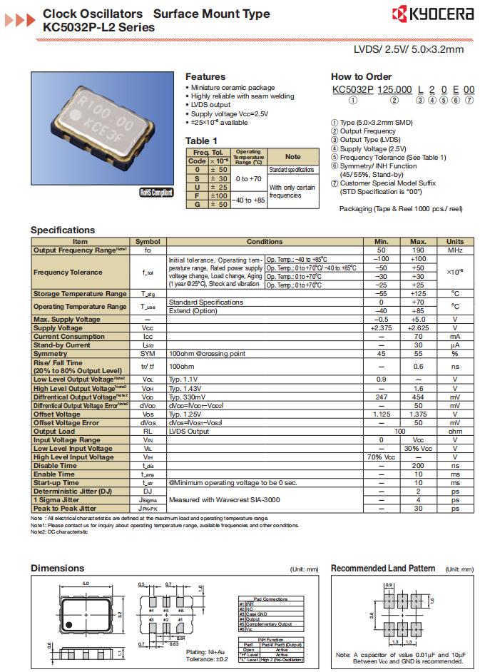 KC5032A150.000C2GE00 | AVX Corp/Kyocera Corp | KC5032A-C2 | 150MHz | 2.5V, 3.3V | -40°C ~ 85°C |