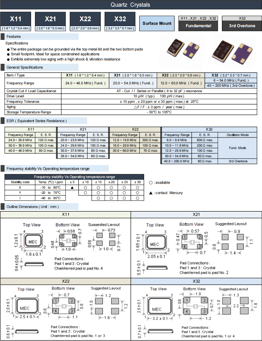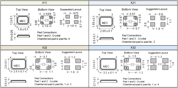 項目/型號 | X11 ( 1.6 * 1.2 * 0.4 mm ) | X21 ( 2.0 * 1.6 * 0.5 mm ) | X22 ( 2.5 * 2.0 * 0.6 mm ) | X32 ( 3.2 * 2.5 * 0.7 mm ) |
