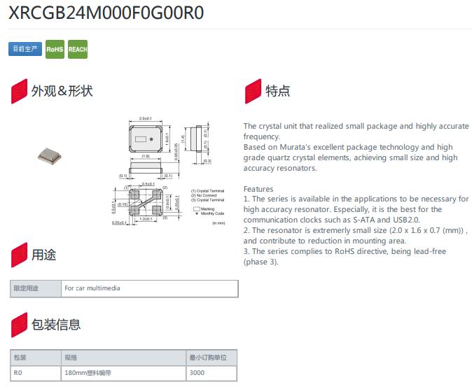 請勿在鹵素氣體環境下使用晶振.即使少量的鹵素氣體,比如在空氣中的氯氣內或封裝所用金屬部件內,都可能產生腐蝕.同時,請勿使用任何會釋放出鹵素氣體的樹脂.日本muRata晶振HCR2016,XRCGB24M000F0G00R0無源晶振