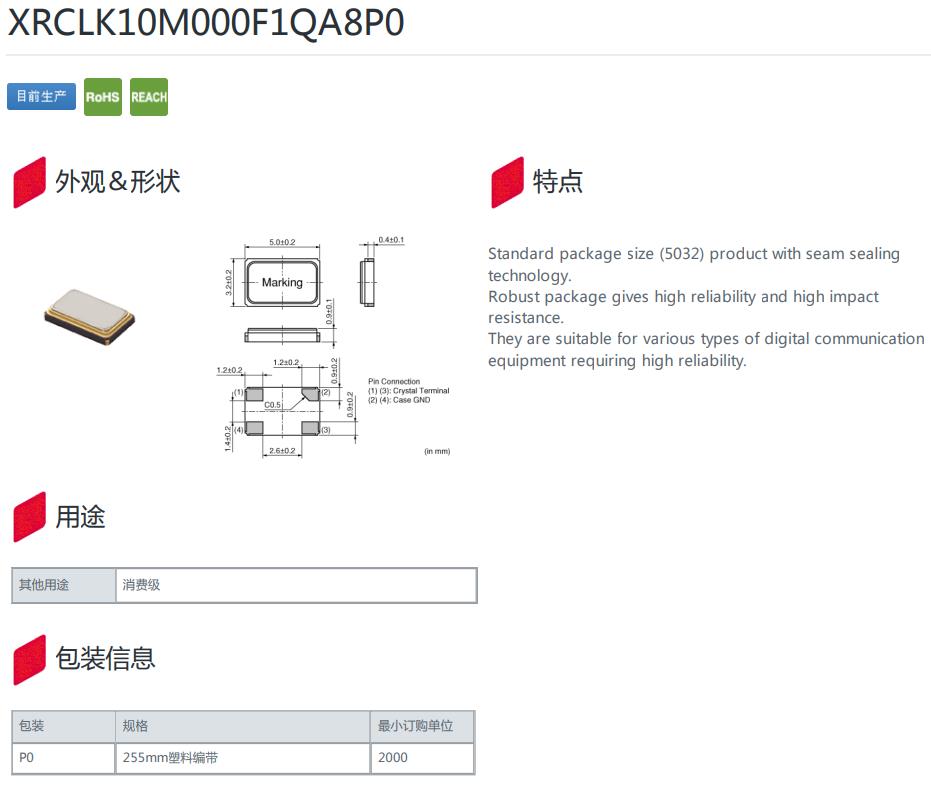 XRCLK10M000F1QA8P0|10MHz|-30~85℃|8pf|5032mm,XRCLK10M000F1QA8P0晶振,頻率10MHz,工作溫度-30~85℃,負載8pf,尺寸5032mm,高可靠性晶振,無線通訊設備晶振,WIFI晶振,通信設備晶振,數碼相機晶振,醫療設備晶振.