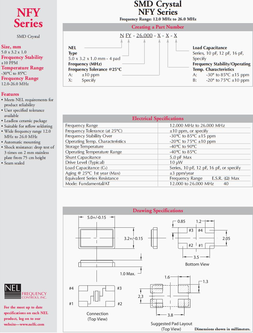 NEL耐爾晶振,6G信號放大器晶振,NFY-15.000-AA12PF貼片晶振,歐洲NEL晶振公司,歐美晶振,石英晶振,進口晶振,貼片晶振,高品質晶振,耐環境晶振,耐沖擊晶振,無源晶振,環保無鉛晶振,產品可靠性符合NEL要求,用戶指定公差,無鉛陶瓷封裝,適用回流焊,寬頻率范圍12.0MHz至26.0 MHz,自動安裝防震:在2mm不銹鋼板上從75 cm高度開始進行3次跌落試驗,符合國際標準