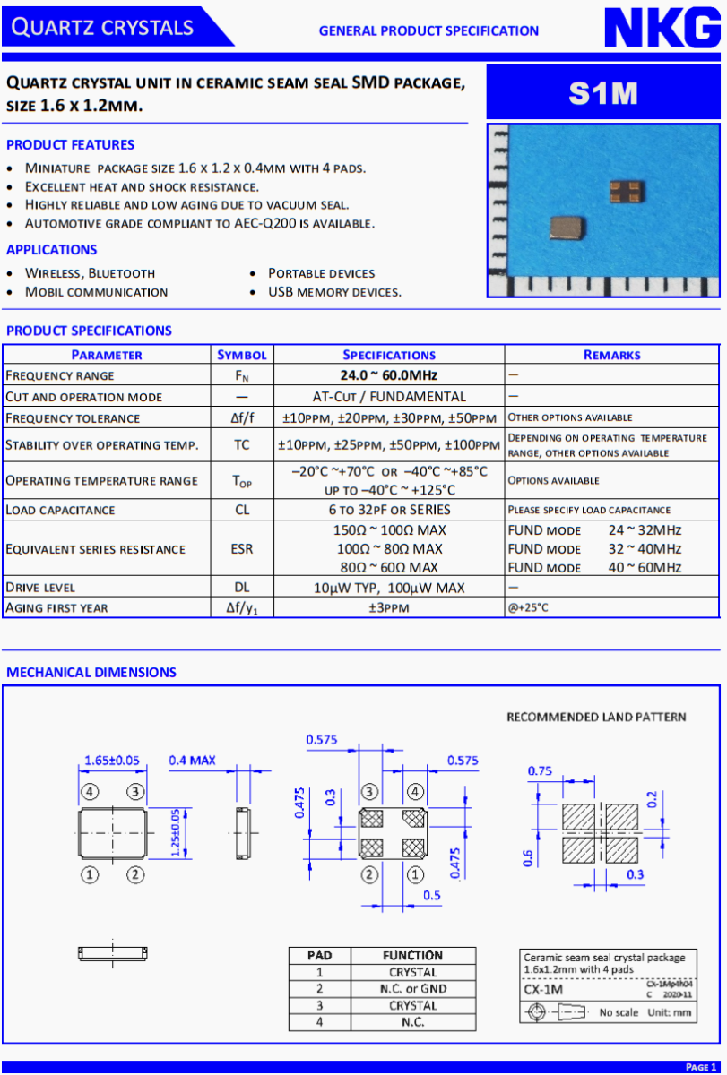 NKG高品質(zhì)晶振,汽車(chē)多媒體系統(tǒng)晶振,S1M25.0000F18E23-EXT超小型晶振,NKG晶振公司,無(wú)源晶振,貼片晶振,超小型晶振,1612晶振,汽車(chē)多媒體設(shè)備晶振,6G通訊設(shè)備晶振,6G網(wǎng)絡(luò)終端晶振,無(wú)源晶振,貼片晶振。石英晶體單元在陶瓷縫密封SMD封裝,尺寸1.6 x 1.2mm。產(chǎn)品特點(diǎn):微型包裝尺寸1.6 x 1.2 x 0.4mm,有4個(gè)襯墊。優(yōu)異的耐熱性和抗震性。真空密封,可靠性高,老化率低。符合AEC-Q200標(biāo)準(zhǔn)的汽車(chē)級(jí)產(chǎn)品可供選擇。應(yīng)用范圍:無(wú)線(xiàn)、藍(lán)牙、移動(dòng)通訊、便攜設(shè)備、USB存儲(chǔ)設(shè)備