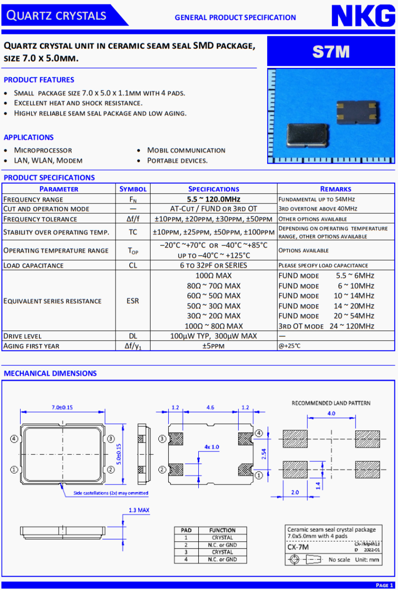 NKG7050晶振,S7M120.0000F18MYY-EXT晶振,車載氛圍燈晶振,。NKG晶振公司,無線傳輸晶振,汽車藍牙晶振,移動通訊晶振,石英晶振,石英晶體單元在陶瓷縫密封SMD封裝,尺寸7.0 x 5.0mm。S7M。產品特點:小包裝尺寸7.0 x 5.0 x 1.1mm, 4個襯墊。優異的耐熱性和抗震性。高可靠的縫封封裝,低老化。應用:微處理器,局域網,無線局域網,調制解調器,移動通信,便攜式設備。高品質晶振,低損耗晶振,汽車級晶振,車載音響系統晶振,便攜設備晶振,USB存儲設備晶振。4025晶振,小體積晶振,超薄晶振,貼片晶振,進口晶振,