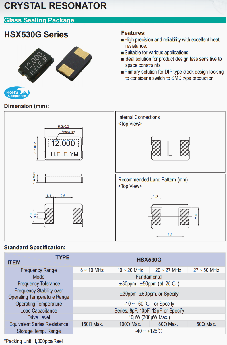 X1H012000FK1H | 加高晶振 | HSX531S | 12 MHz | ±50ppm | 7pF |
