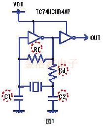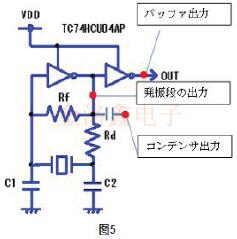設(shè)計振蕩器電路時,有必要認識到各個組件的作用.因此,表1中以振蕩電路(圖1)為例,以通用C-MOSIC(東芝74HCU04AP)為例說明了每個電路的作用.
