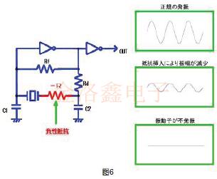 這是為了確認晶振振蕩電路具有多少振蕩余量,并且根據(jù)所獲得的值來預測振蕩穩(wěn)定性的測量.如圖6所示,如果將一個電阻器(R)與振動器串聯(lián),并且該值增大,則振動器將不會在某個電阻值以上振蕩.即將停止振蕩之前的電阻值為負電阻值.