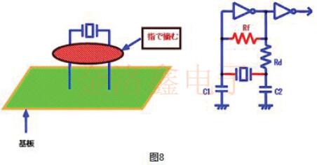 在要使用的振蕩電路中,檢查振蕩器是否可能以正常振蕩模式以外的其他模式振蕩.確定換能器的振蕩模式為基本模式時,確認高振蕩模式(從基本振蕩到第三階諧波的容易性)的簡單方法如圖9所示.2),示波器的波形為3.如果沒有泛音振蕩,則可以判斷為沒有異常振蕩的可能性.相反,示波器波形為3.如果發(fā)生泛音振蕩,則可以確定存在異常振蕩的可能性.用浸水的手指檢查的原因是在換能器端子之間形成一個小的電阻,并在圖8的電路圖中減小Rf以便于在高頻范圍內(nèi)振蕩.