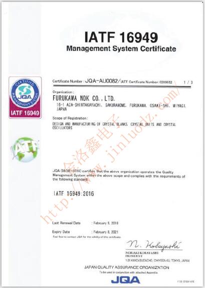 以上的料號只是例舉的一部分,NDK適用于汽車電子產品的石英晶振遠不止這些,而且這部分型號只是普通晶體系列的,NDK公司汽車電子晶振系列分類,還有時鐘晶體振蕩器,溫補晶振,32.768K晶振等,以下是日本電波工業株式會社獲得的IATF:16949認證證書. NX3225GA-26.000M-STD-CRG-2石英晶體NX3225SA-32M-EXS00A-02994貼片石英晶體NX3225SA-16.000000MHZ-B3汽車級晶振NX3225GA-24.576M-STD-CRG-2進口晶振NX3225GA-26MHZ-TI壓電石英晶體NX3225SA-25.000M-STD-CSR-3諧振器NX3225SA-26.000000MHZ-G3車載晶振NX3225GA-26.000M-STD-CRG-1日本電波晶振NX3225GA-16.000M-STD-CRG-2晶振NX3225SA-20.000M-STD-CSR-3汽車電子晶振NX3225SA-39.000000MHZ-B4汽車導航晶振NX3225GA-14.31818M-STD-CRG-2石英晶體諧振器NX3225GA-27.000M-STD-CRG-1進口晶振NX3225SA-26.000M-STD-CSQ-1日產晶振NX3215SA-32.768K-STD-MUA-8貼片石英晶體NX3225GA-32M-EXS00A-CG02611貼片晶振NX3225SA-24.000MHZ-STD-CSR-1日本電波晶振NX3225SA-30.000M-STD-CSR-3石英水晶振動子NX2520SA-16MHZ-STD-CSW-4壓電石英晶體NX3225GA-20.000M-STD-CRG-2石英晶振NX3225SA-16.000MHZ-STD-CSR-1石英晶體諧振器NX3225SA-32MHZ-EXS00A-CS02368貼片諧振器NX3215SA-32.768K-STD-MUA-9諧振器NX3225SA-20.000M-STD-CRS-2石英水晶振動子NX3225SA-32.000MHZ-STD-CSR-1貼片晶振NX3225SA-25.000M-STD-CRS-2石英晶體NX3215SA-32.768K-STD-MUA-14日本NDK晶振NX3225SA-16.000M-STD-CRS-2貼片諧振器NX3225SA-26.000MHZ-STD-CSR-1石英晶振NX3225SA-27M-STD-CRS-2壓電石英晶體NX3215SA-32.768K-STD-MUS-2日產晶振NX2520SG-19.2M-STD-CTX-1石英晶體NX3225SA-20.000MHZ-STD-CSR-1無源晶振NX3225SC-30.320M-EXS00A-CS03981晶振NX3225SA-27.000MHZ-STD-CSR-1汽車導航晶振NX3225SA-26.000000MHZ-G4石英晶體諧振器NX3225SA-14.31818MHZ-STD-CSR-1汽車級晶振NX3225SA-12MHZ-STD-CSR-6進口晶振NX3225SA-16.000000MHZ-T1石英晶振NX3225SA-26.000000MHZ-B1貼片晶振NX3225SA-24.576MHZ-STD-CSR-1車載晶振NX3225SA-16MHZ-STD-CSR-6日本電波晶振NX3225SA-26.000000MHZ-G2無源晶振NX3225GA-20.000M-STD-CRG-1晶振