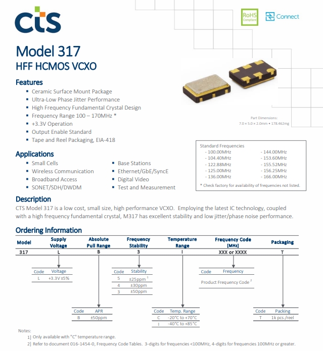 317LB3C1250T | CTS | 317 | VCXO | 125 MHz | HCMOS | 3.3V | ±50ppm |