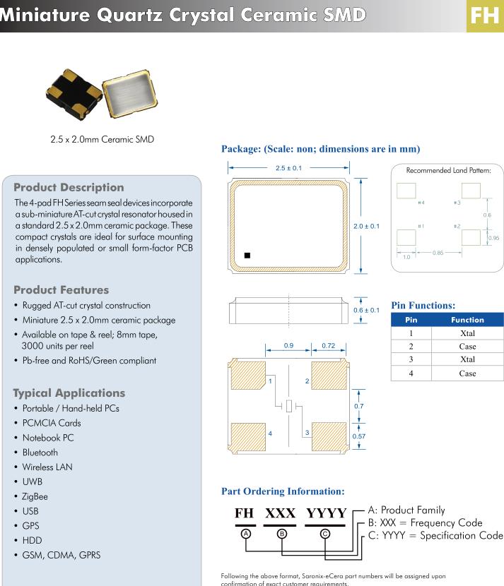 4-pad FH系列接縫密封裝置微型AT-cut石英晶體諧振器標(biāo)準(zhǔn)2.5 x 2.0mm陶瓷封裝。這些致密晶體是表面安裝的理想選擇在人口密集或小形狀因素PCB應(yīng)用程序。