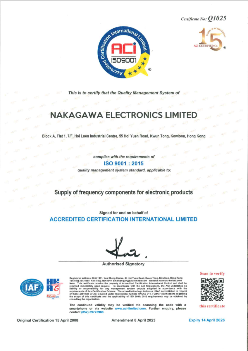 NAKAGAWA ELECTRONICS LIMITED (NKG晶振)致力于提供高質(zhì)量的產(chǎn)品,并因此維護質(zhì)量和管理體系,以確保能夠保證這一點。不僅對我們的客戶,而且對我們自己的員工和社區(qū),我們以最高的法律和道德標準協(xié)調(diào)我們的所有活動,履行社會責任。我們公司的運作是參照相關的企業(yè)管治準則和包括EICC行為準則在內(nèi)的國際標準來制定和更新的。中川電子有限公司(NKG)香港總部以ISO 9001為基礎運作生產(chǎn)石英晶體諧振器,并定期接受審核。您可以在這里查看證書。我們的生產(chǎn)基地除了擁有兩個體系資質(zhì)外,還擁有更先進的設置,涵蓋了TS 16949和全面的健康和安全程序(基于OHSAS要求)。除了強制性的內(nèi)部XRF測試(基于QC080000模型)外,工廠還運行了一個擴展系統(tǒng),以確保我們的產(chǎn)品符合環(huán)境要求。