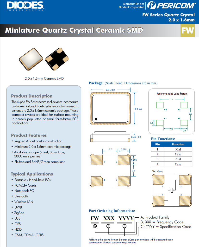 FW2400014 | Diodes 晶振 | FW | 24 MHz | ±50ppm | ±30ppm | 20pF |
